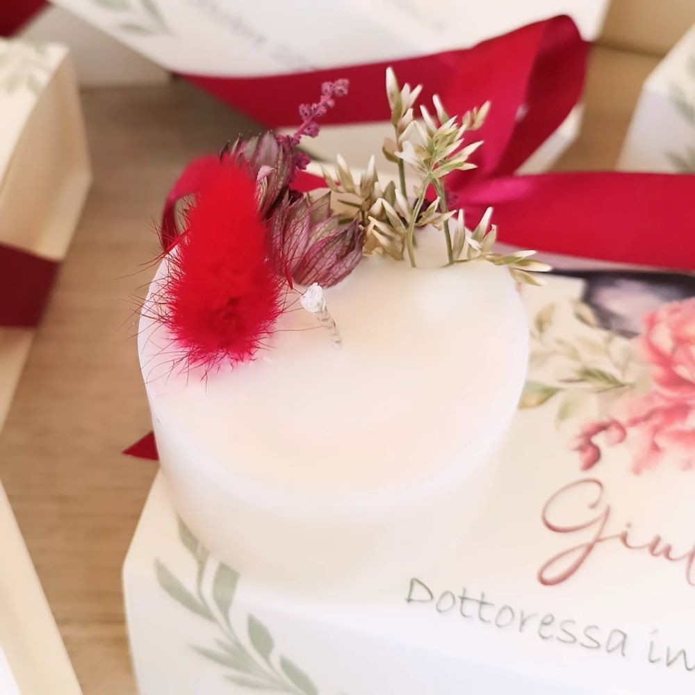 Il rosso è il colore della laurea, ma noi lo interpretiamo con eleganza. Utilizziamo nastri di pregio in diverse sfumature per avvolgere le nostre scatole eleganti avorio o avana. Ogni confezione è completata da un tag personalizzato esterno, coordinato graficamente alla bomboniera. Questo piccolo bigliettino riporta i tuoi dati e rende il packaging professionale e armonioso, perfetto per presentare il tuo traguardo con la classe che meriti.