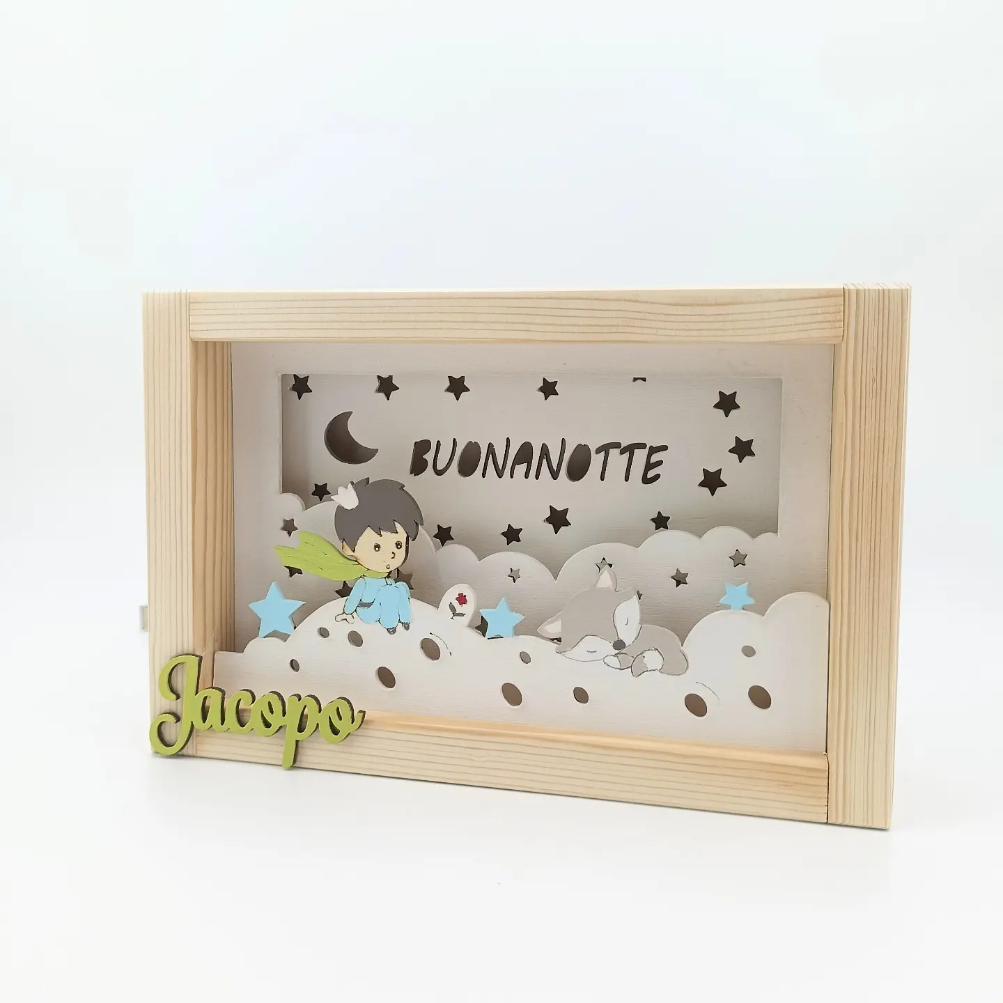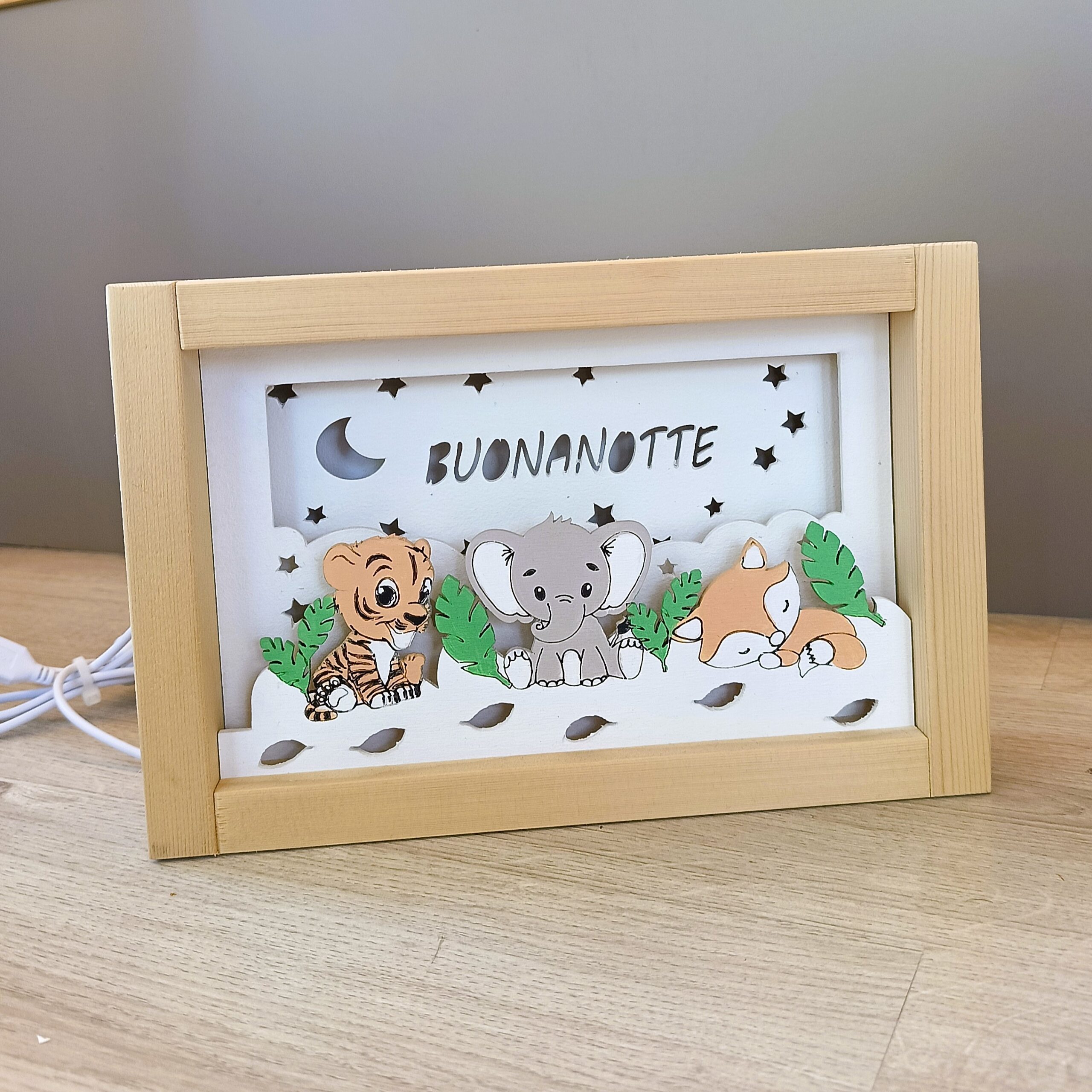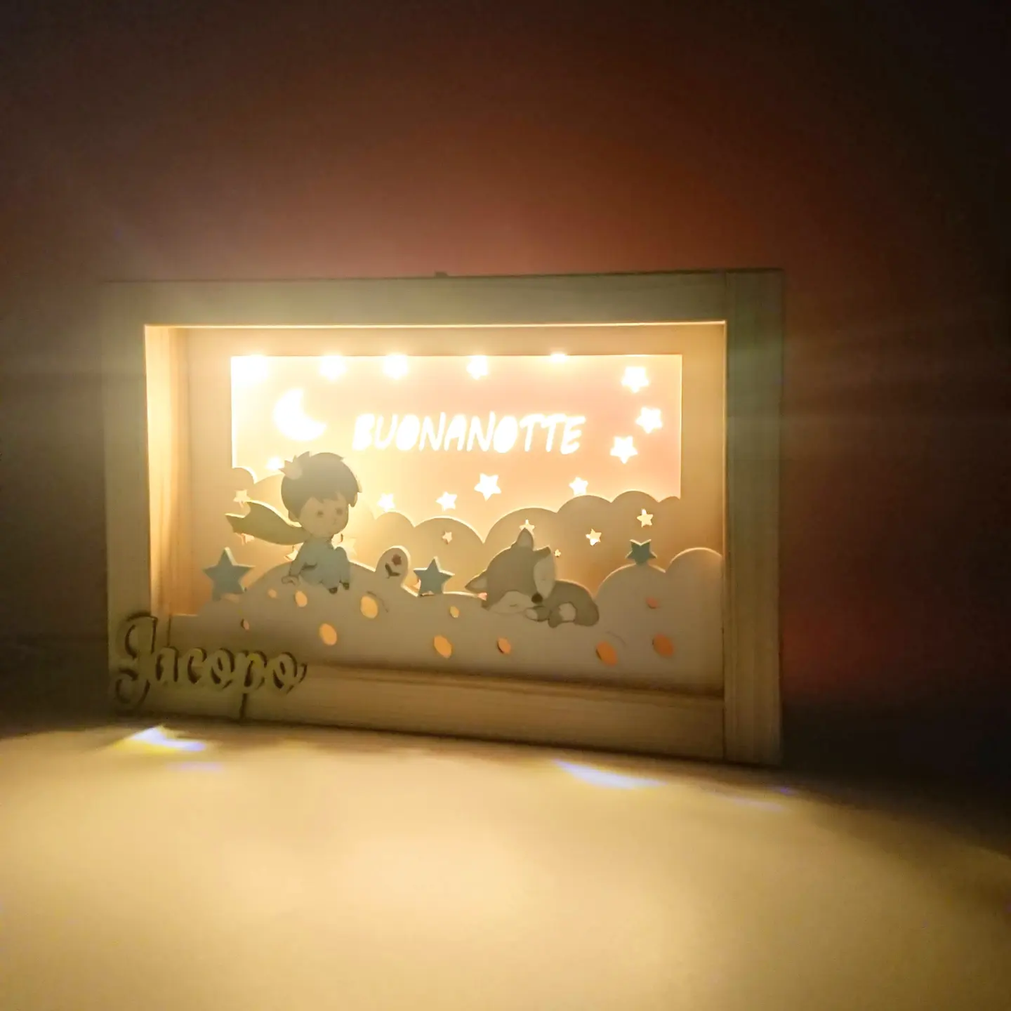 Accompagna il tuo bambino nel mondo dei sogni con la nostra luce notturna artigianale. Realizzata in legno naturale, diffonde una luce soffusa e rassicurante, perfetta per allontanare le paure del buio e creare un’atmosfera magica nella cameretta.