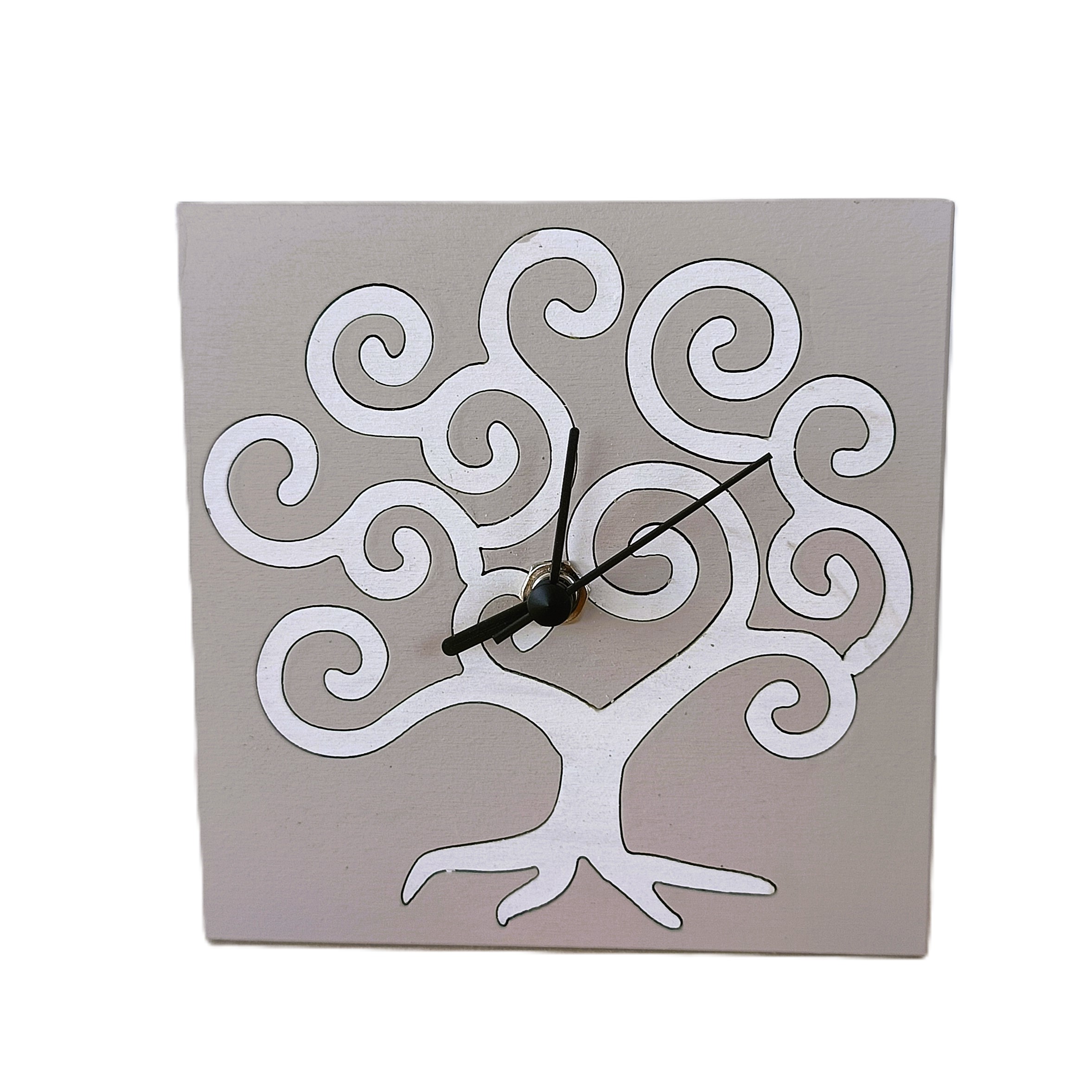 E’ possibile scegliere l’Orologio tra i colori disponibili Bianco e Tortora chiaro per la struttura, Bianco, Tortora chiaro e Tortora scuro per la decorazione.