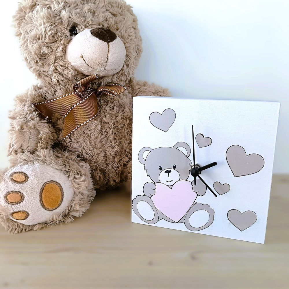 La base è disponibile in Bianco o Tortora, ma il cuore della personalizzazione risiede nelle decorazioni. Puoi scegliere tra Rosa, Azzurro e molte altre tonalità per adattarlo perfettamente allo stile della stanza. Tuttavia, se desideri un orologio da tavolo per bambini con misure o colori specifici, scrivici a info@laboratorio19.it: realizzeremo la tua idea su misura. Se è un regalo, inserisci “SI” nel box dedicato: confezioneremo noi lo scrigno con eleganza e un bigliettino scritto col cuore.
