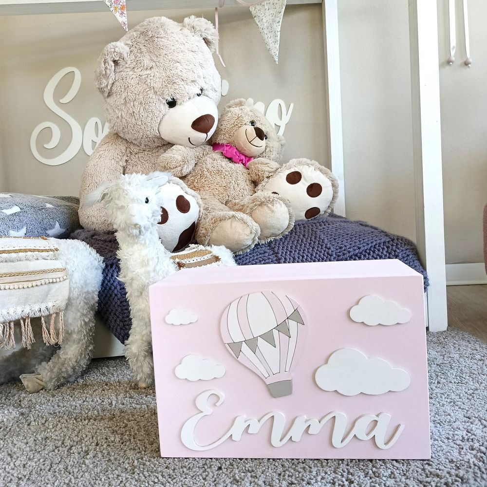 • Personalizzazione: Nome in rilievo e decorazioni a scelta (mongolfiera, orsetto, elefante, ecc.).