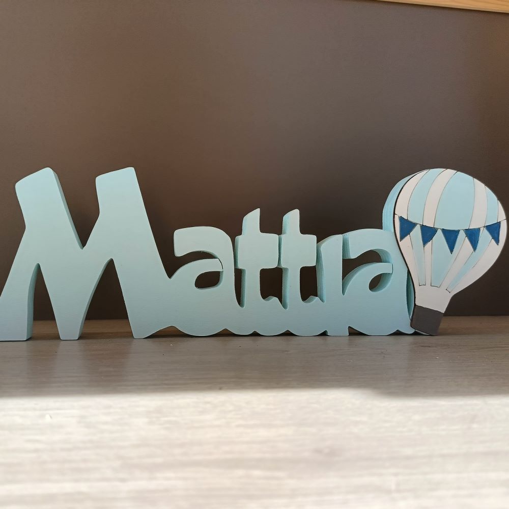 Le nostre creazioni sono regali perfetti per nascite o battesimi. Infatti, la scritta piace a genitori e bambini. Possiamo aggiungere soggetti come la mongolfiera o l’orsetto.