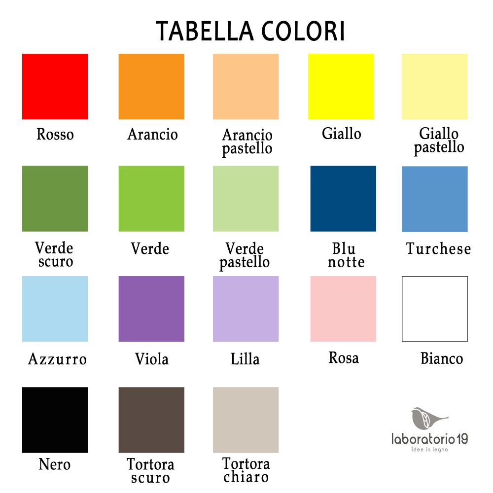 Bianco, Nero, Tortora chiaro, Tortora scuro, Rosa, Lilla, Viola, Azzurro, Blu, Turchese, Rosso, Arancione, Arancione pastello, Giallo, Giallo pastello, Verde, Verde pastello, Verde salvia