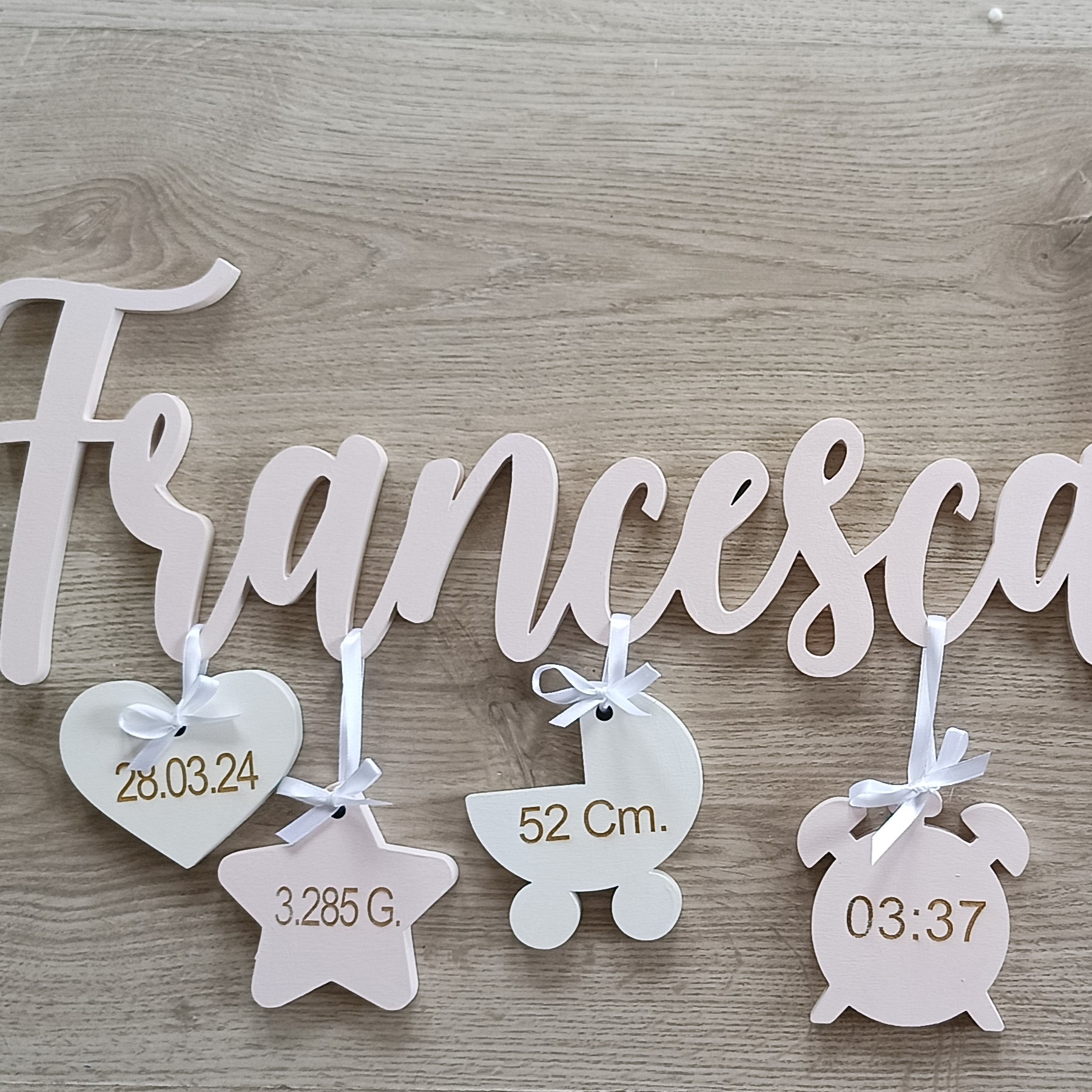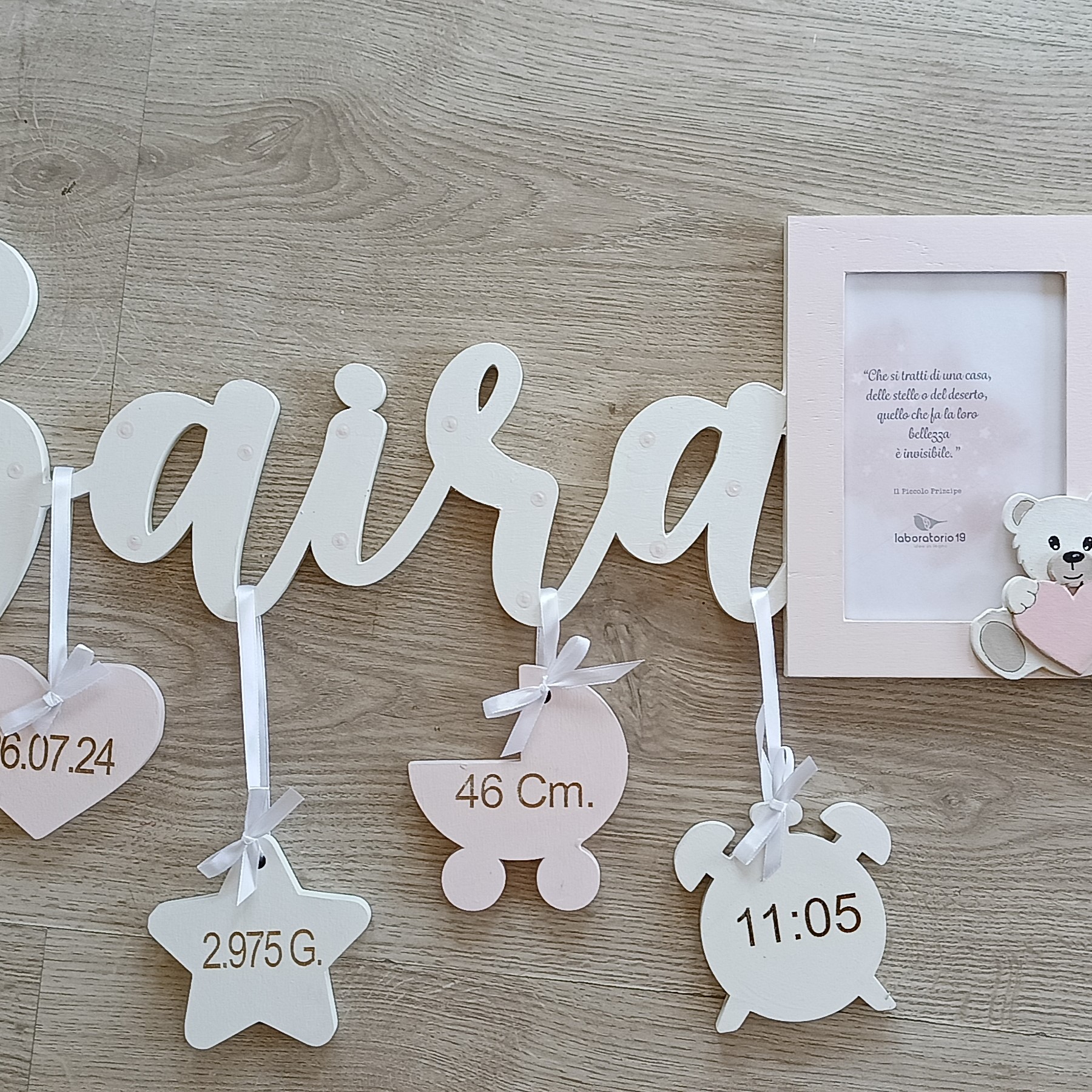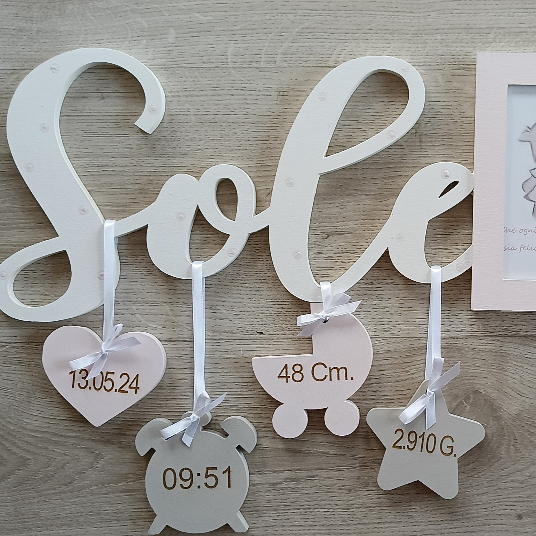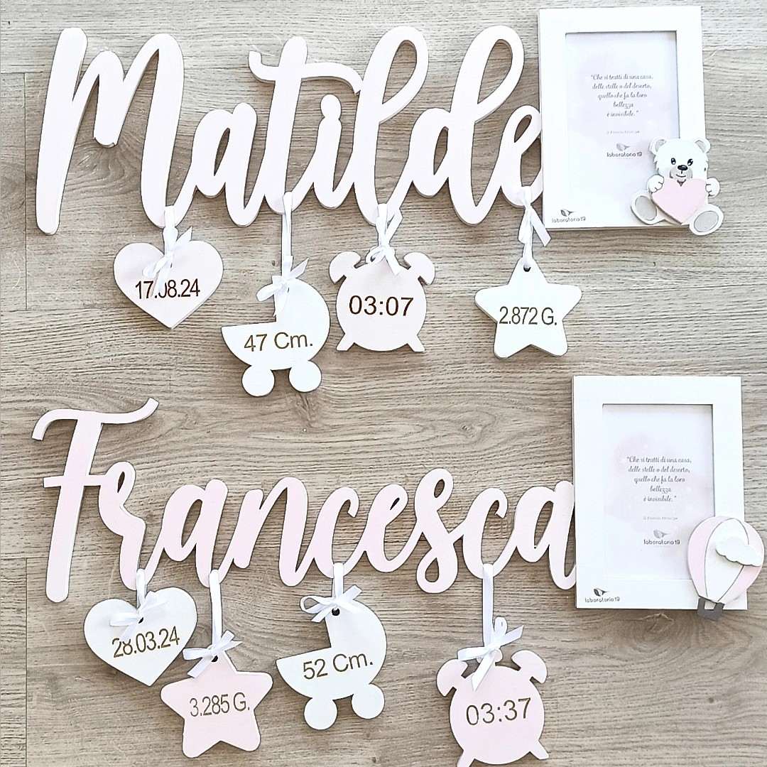 - Componenti: Corpo centrale con nome, 4 pendagli in legno e una cornice portafoto.