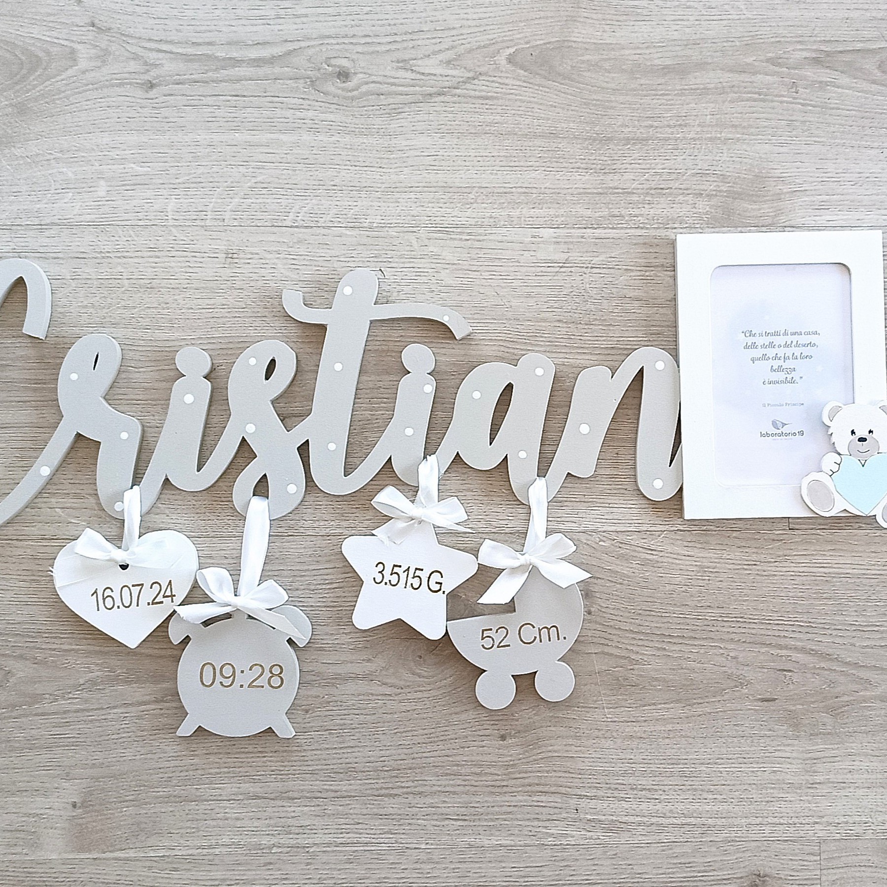- Componenti: Corpo centrale con nome, 4 pendagli in legno e una cornice portafoto.